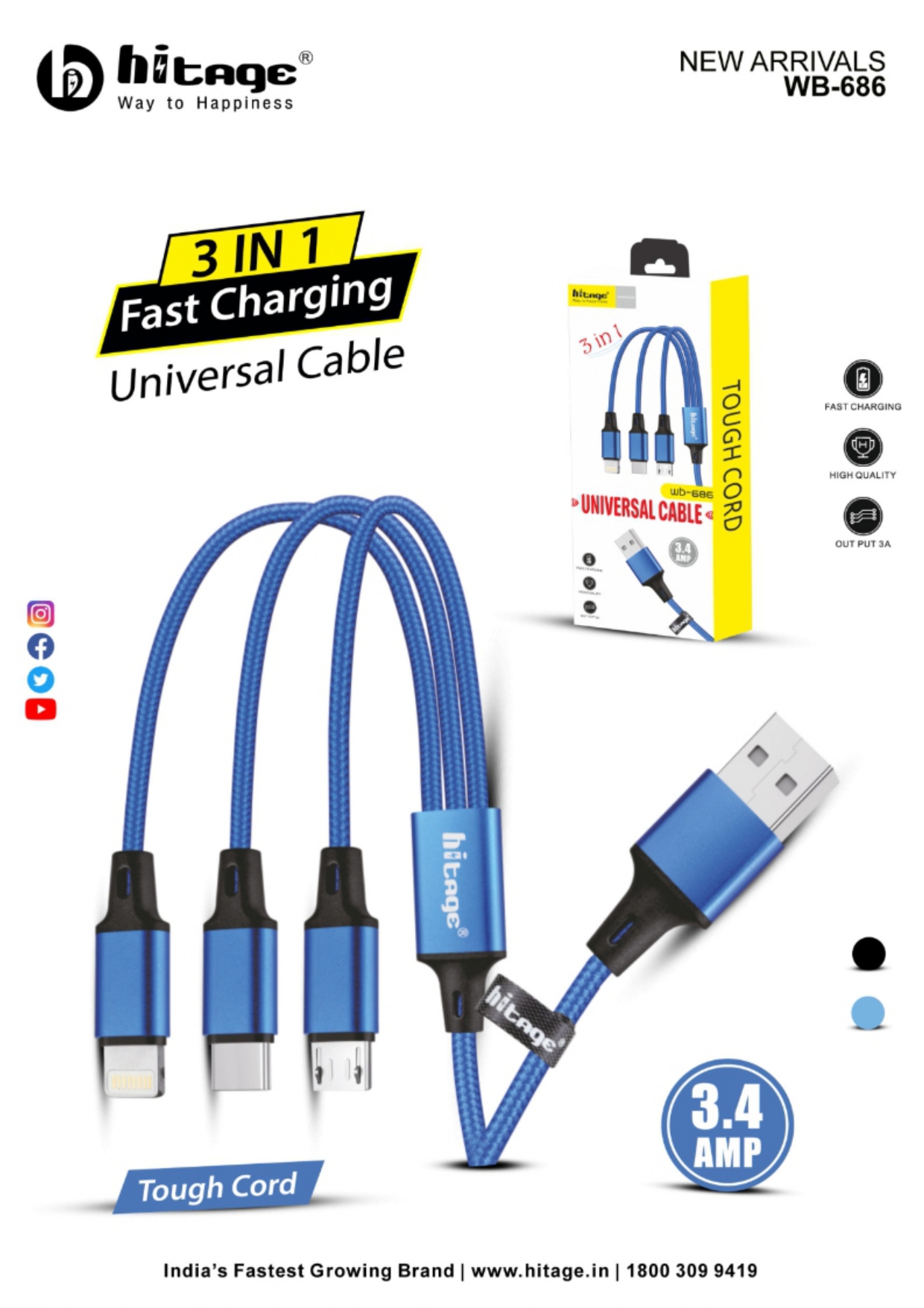 Hitage WB-686 3 in 1 Fast Charging Data Cable Hitage has Type- C, Micro and Lightning port. It has 3.4 A Quick Charge technology. Hitage braided cables are versatile, high in tensile strength, flexible and is 1 meter in length, optimized for easy use for your comfort at home or office, helps you to overcome distance restrictions. When it comes to quality and strength Hitage cable surpasses the ordinary with its high-quality & tangle-free design.